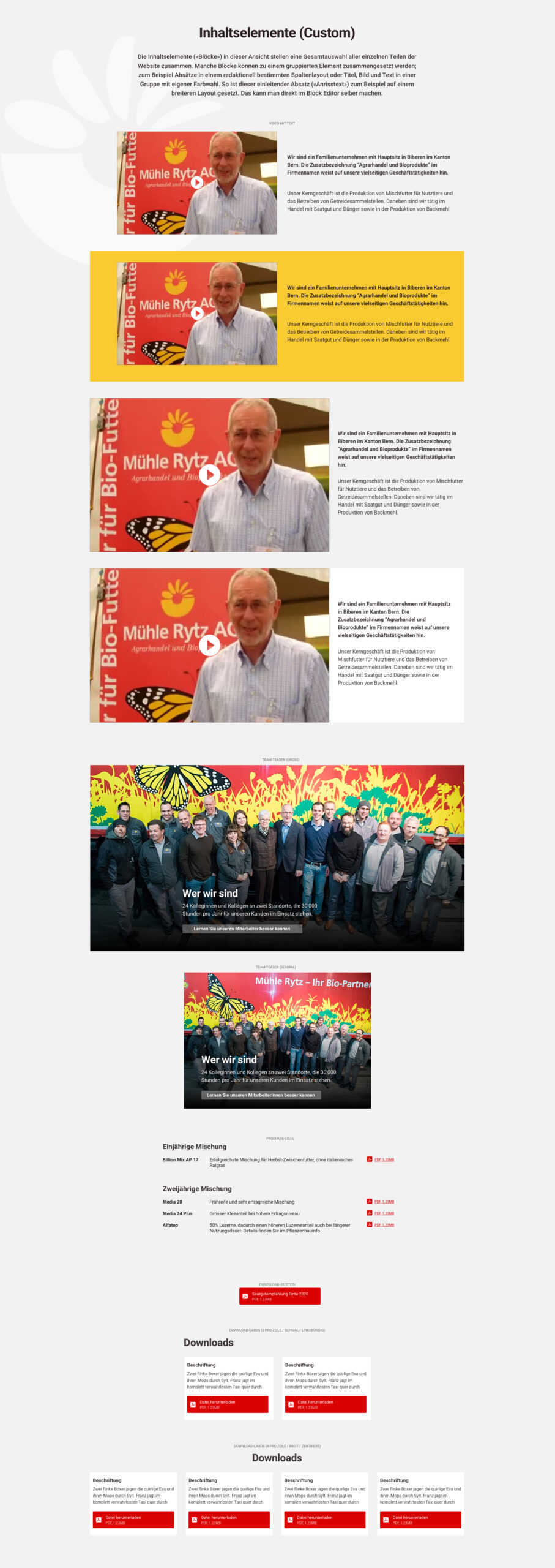 Ein Beispiel dafür ist in diesem Beitrag zu sehen: verschiedene Blöcke werden mit ihren Layout- und Farbvarianten dargestellt. Eine solche Konstellation wird nie eins zu eins auf der Website vorkommen – aber die Kund:innen erkennen, dass jedes Element (jeder Block) individuell angepasst werden kann.