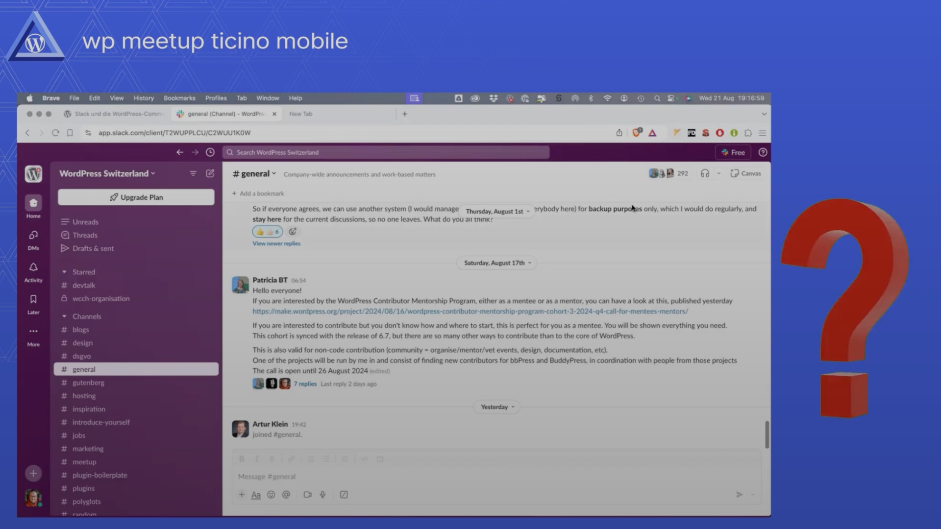2024 wurde ich vom Meetup-Gründer Markus Winter eingeladen, einen Vortrag darüber zu halten, wie die internationale WordPress-Community Slack für ihre Online-Kommunikation nutzt. Mein Remote-Vortrag für das WP Meetup Ticino Mobile ist als Videoaufzeichnung auf dem Community-Kanal wordpress.tv verfügbar.
